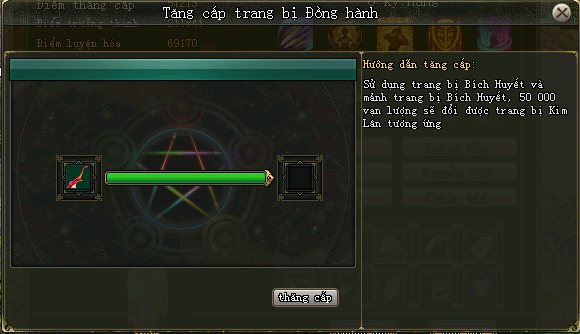 1 Trang bị Bích Huyết + xxx Mảnh Bích Huyết tương ứng + 50.000 vạn → chế tạo thành 1 trang bị Kim Lân tương ứng - Ví dụ: Tăng cấp trang bị Bích Huyết Nhận thành trang bị Kim Lân Nhận cần các nguyên liệu sau: